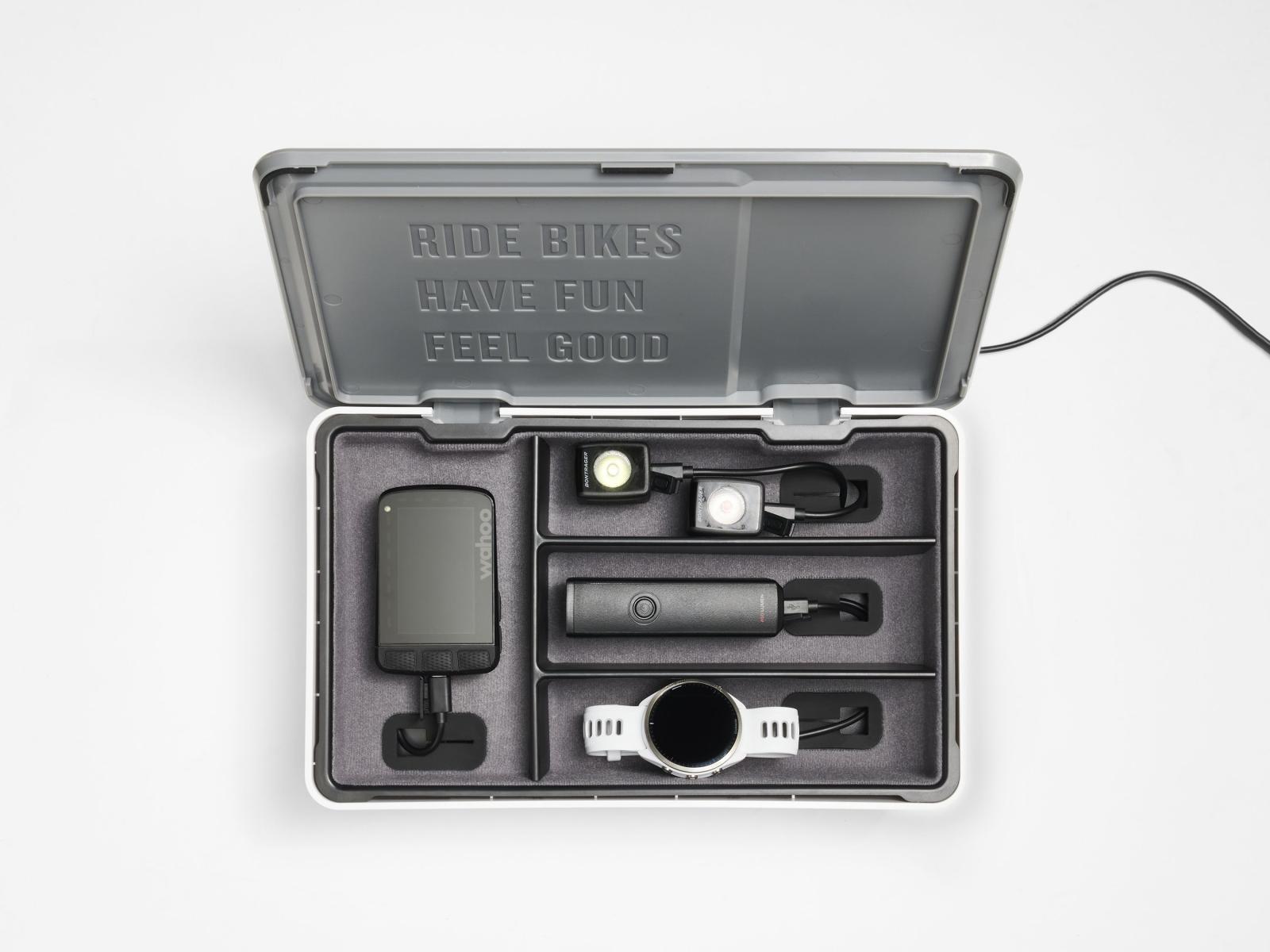 Die Trek CHRGtime Ladestation verhindert nervigen Kabelsalat und lädt deine Fahrradelektronik übersichtlich auf.