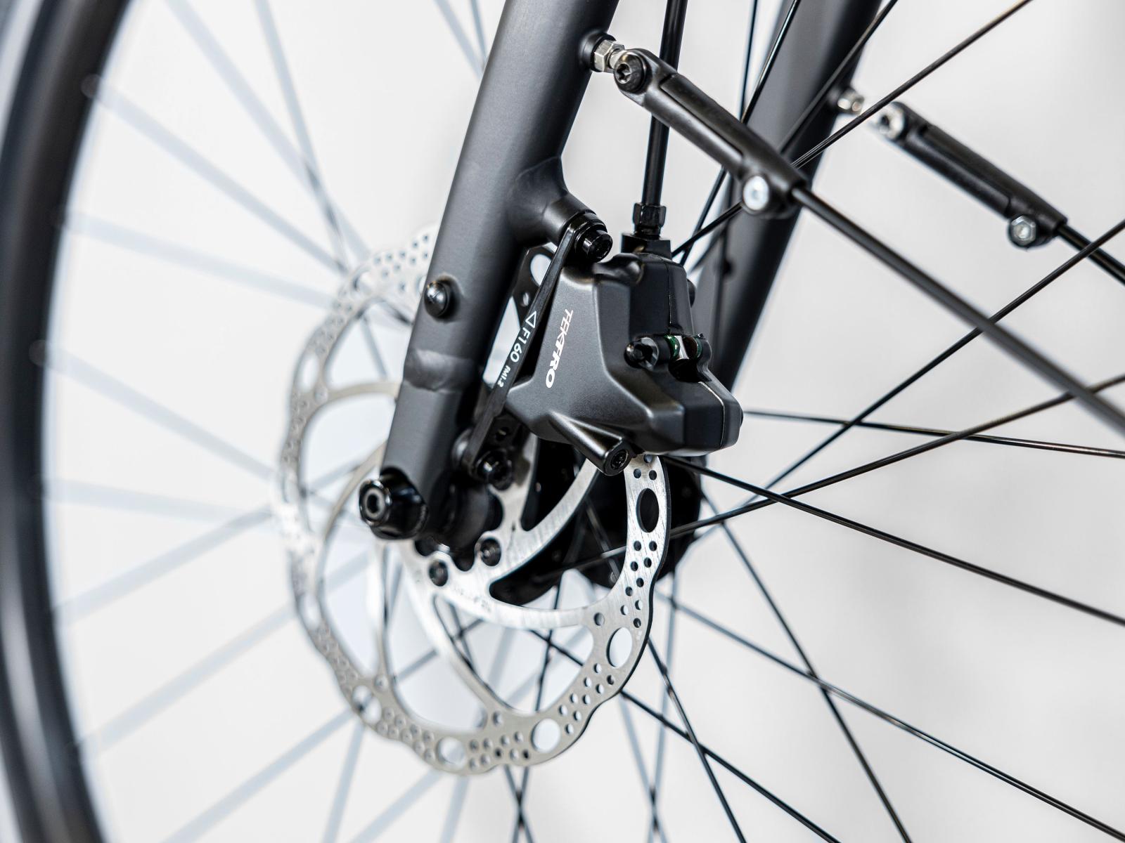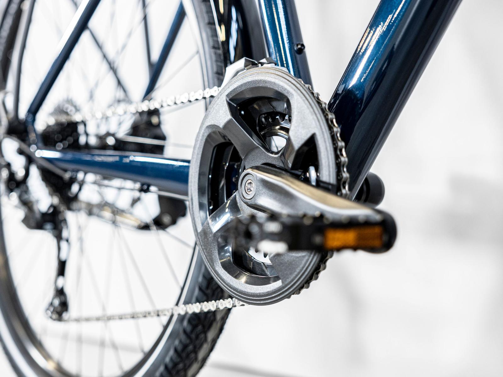 Einen leichten Aluminiumrahmen mit interner Zugführung für einen sauberen Look, 650B-Laufräder mit breiten 50C-Reifen zur Verbesserung der Geländegängigkeit und des Komforts in abwechslungsreichem Terrain, eine zuverlässige 2x9-Schaltung von Shimano mit breitem Übersetzungsspektrum, komfortable ergonomische Griffe, kraftvolle hydraulische Scheibenbremsen für zuverlässige Bremsleistung bei jeder Witterung, einen MIK-kompatiblen Gepäckträger, Beleuchtung, Schutzbleche und einen Seitenständer.