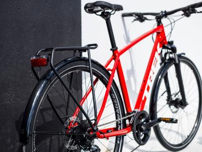 Einen robusten Aluminiumrahmen, eine Federgabel mit Lockout-Funktion und einen 2x9-Antrieb von Shimano mit breitem Übersetzungsbereich. Für Sicherheit und Komfort sorgen ein Nabendynamo am Vorderrad zur Speisung von Scheinwerfer und Rückleuchte, breite, schnell rollende All-Terrain-Reifen von Bontrager für eine Extraportion Traktion, hydraulische Scheibenbremsen, ergonomische Griffe, Schutzbleche, ein MIK-kompatibler Heckgepäckträger und ein Seitenständer.