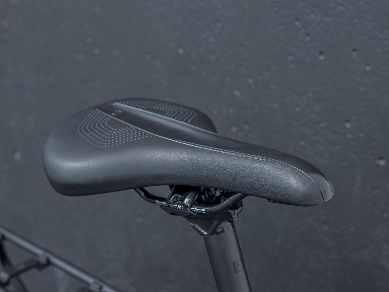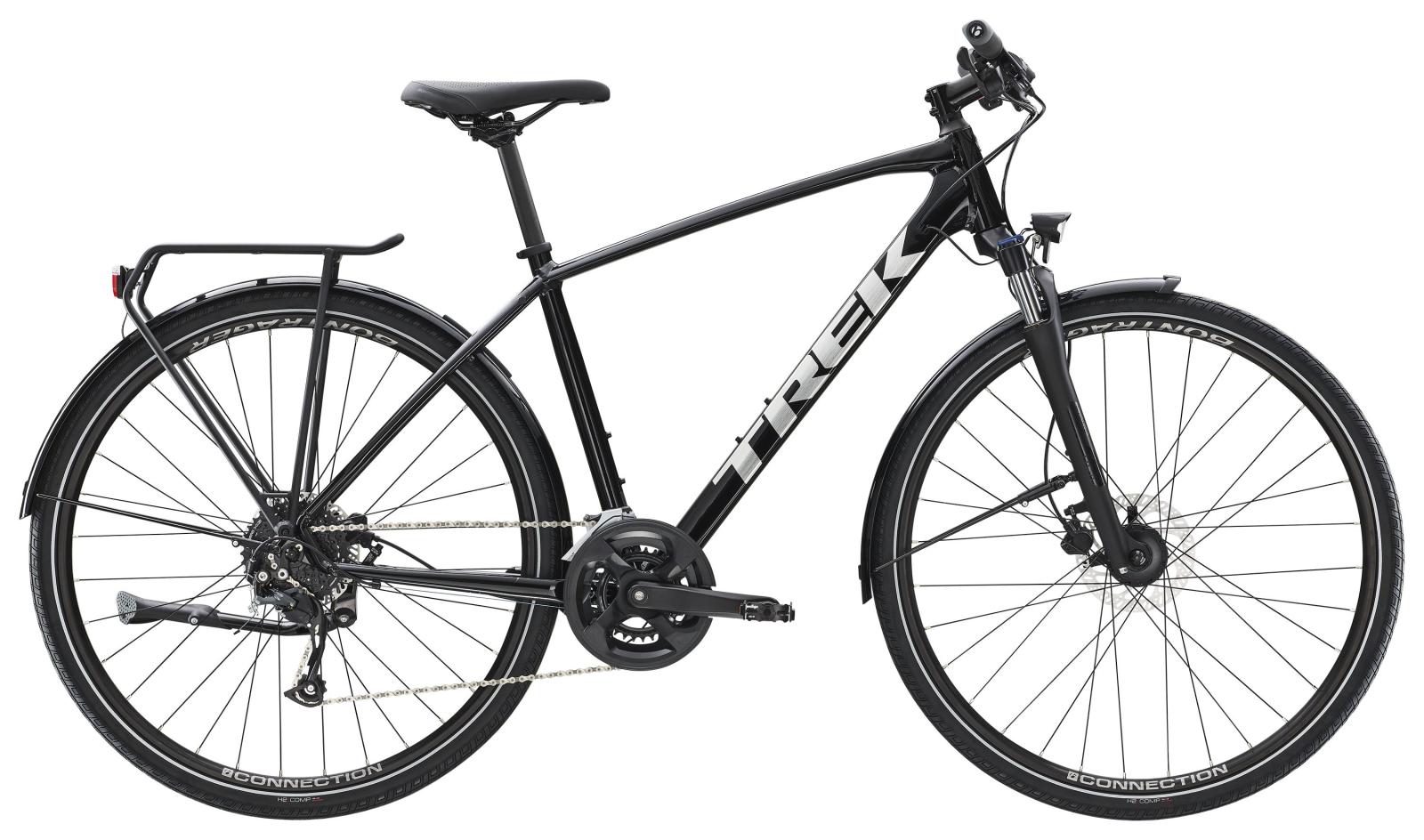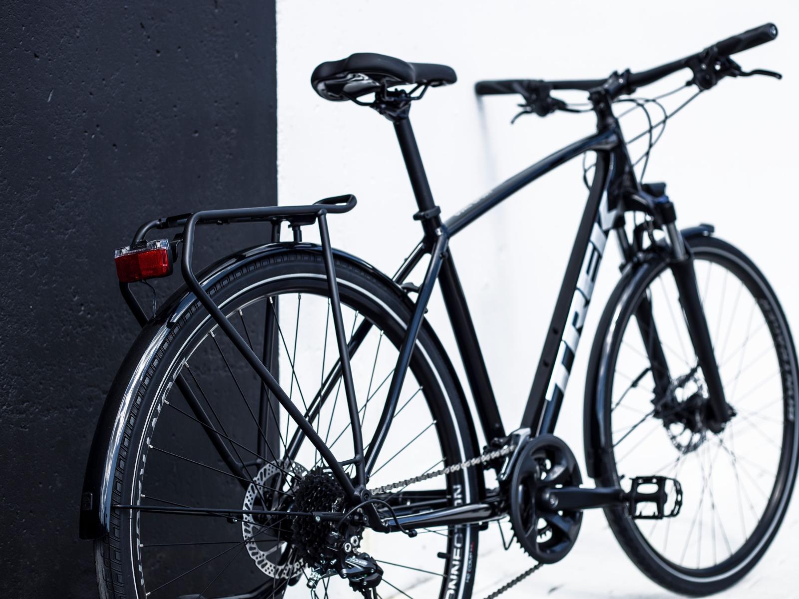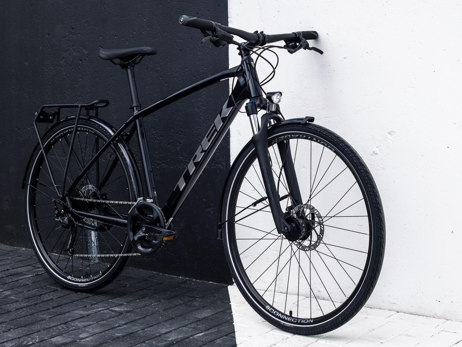 Einen robusten Aluminiumrahmen, eine Federgabel mit Lockout-Funktion und einen 2x9-Antrieb von Shimano mit breitem Übersetzungsbereich. Für Sicherheit und Komfort sorgen ein Nabendynamo am Vorderrad zur Speisung von Scheinwerfer und Rückleuchte, breite, schnell rollende All-Terrain-Reifen von Bontrager für eine Extraportion Traktion, hydraulische Scheibenbremsen, ergonomische Griffe, Schutzbleche, ein MIK-kompatibler Heckgepäckträger und ein Seitenständer.
