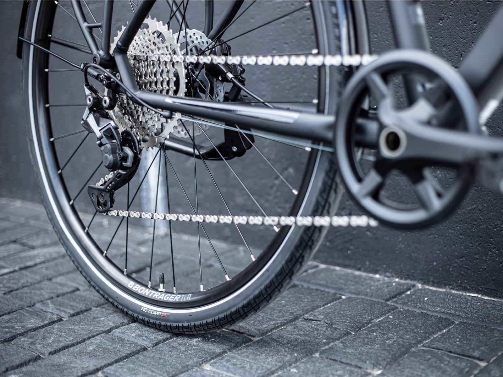 - Dank der hydraulischen Lockout-Funktion an der Federgabel bist du jederzeit effizient unterwegs: blockiert auf glattem Asphalt, geöffnet auf holprigerem Untergrund.