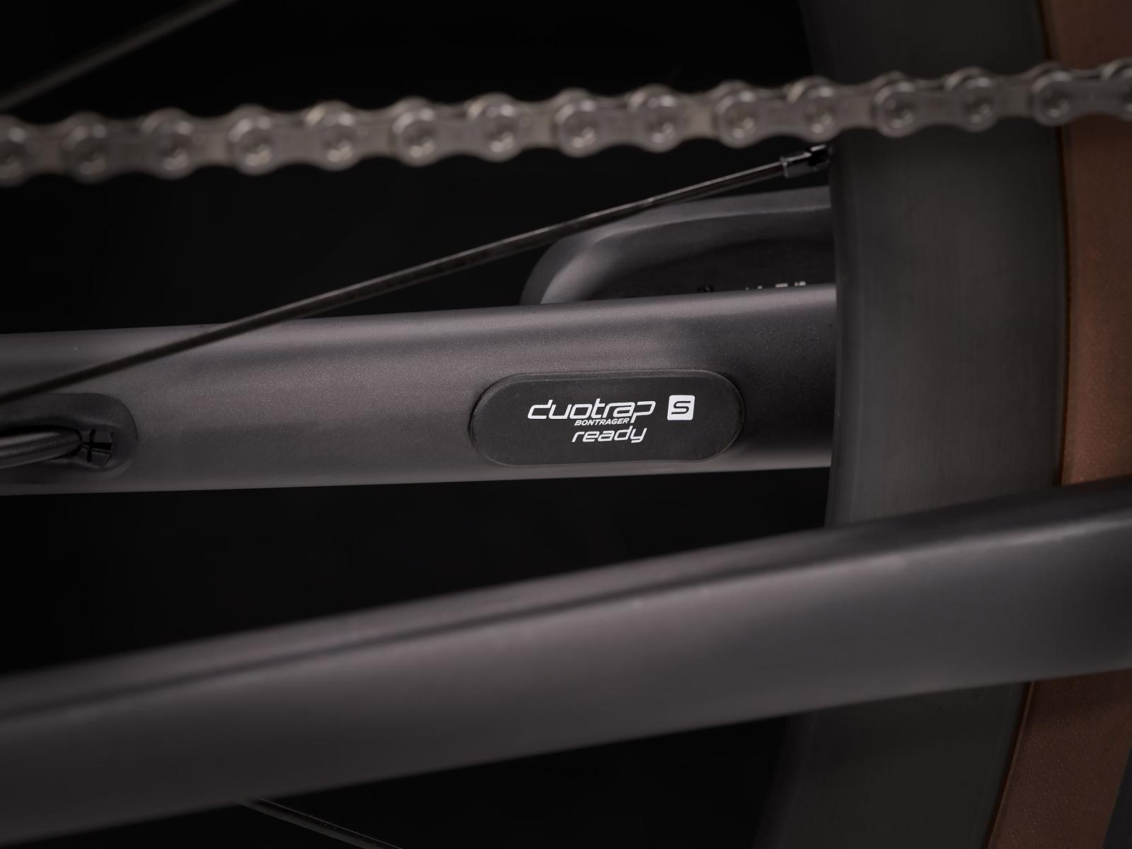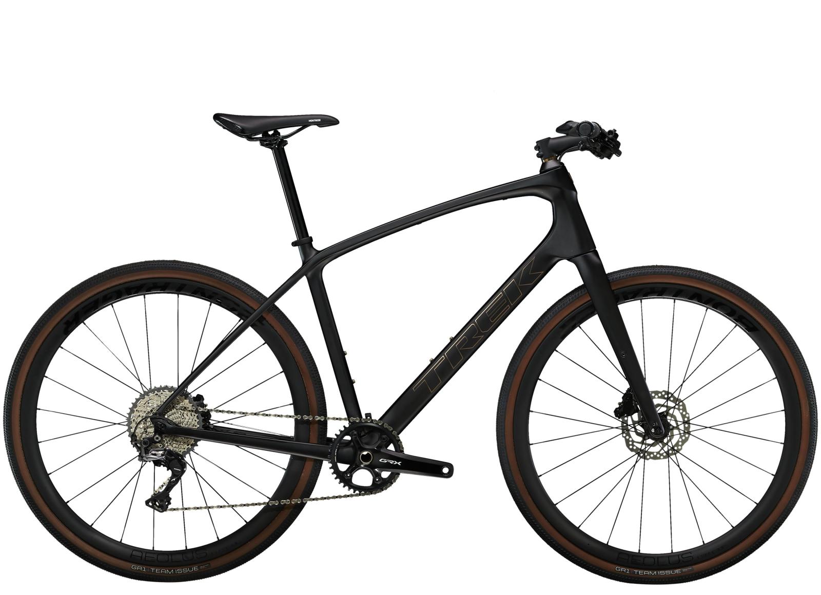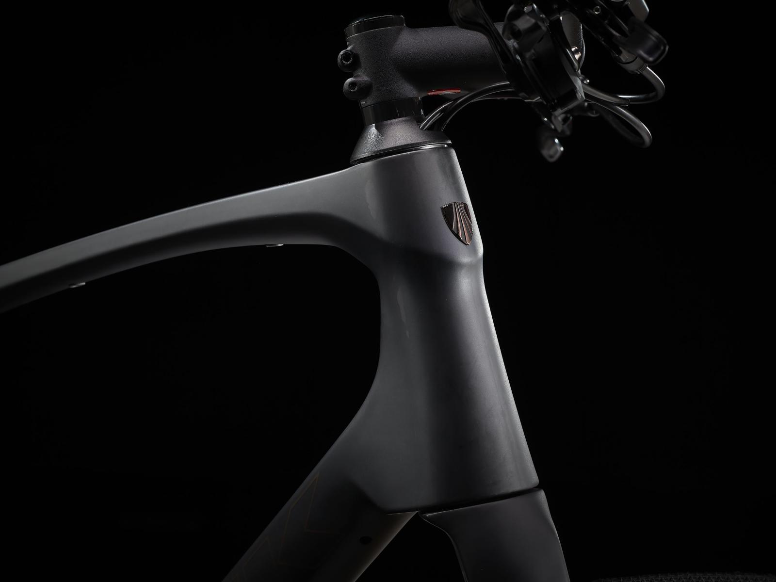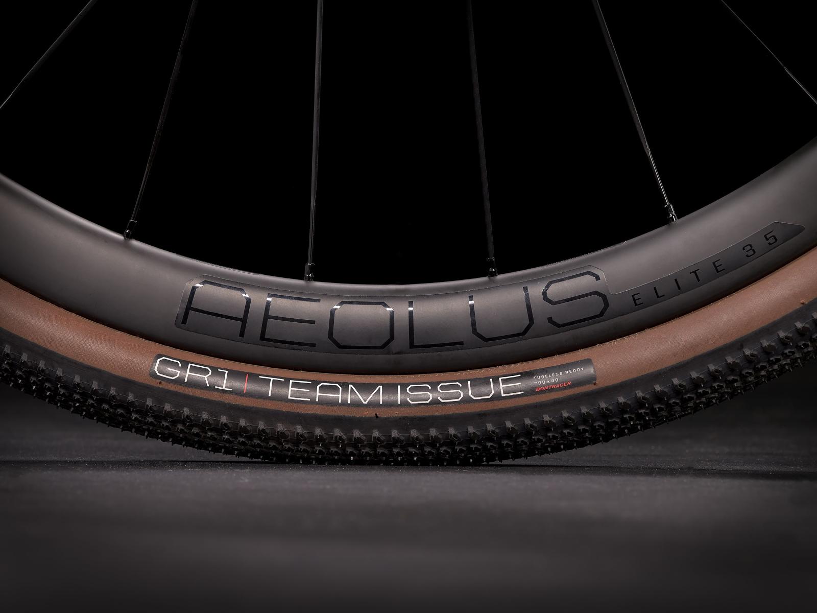 Rahmen und Gabel aus leichtem 400 Series OCLV Carbon, einen Shimano GRX 1x-Antrieb mit breitem Übersetzungsbereich, hydraulische Scheibenbremsen, versteckte Schutzblechösen, leichte Bontrager Aeolus Elite 35 Carbonlaufräder mit hochwertigen Bontrager GR1 Team Issue Tubeless-Ready-Gravelreifen und einen vibrationsdämpfenden Lenker samt ergonomischen Griffen.
